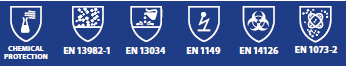 EN 13034 TYPE 6 EN ISO 13982 TYPE 5 EN 1149 -5 EN 1073-2 EN ISO. -